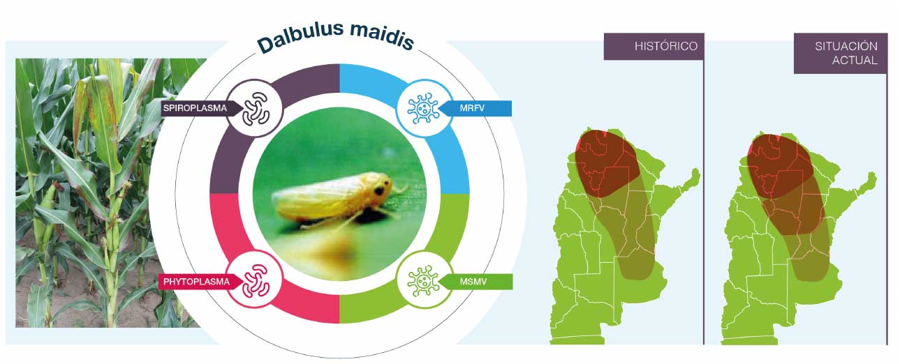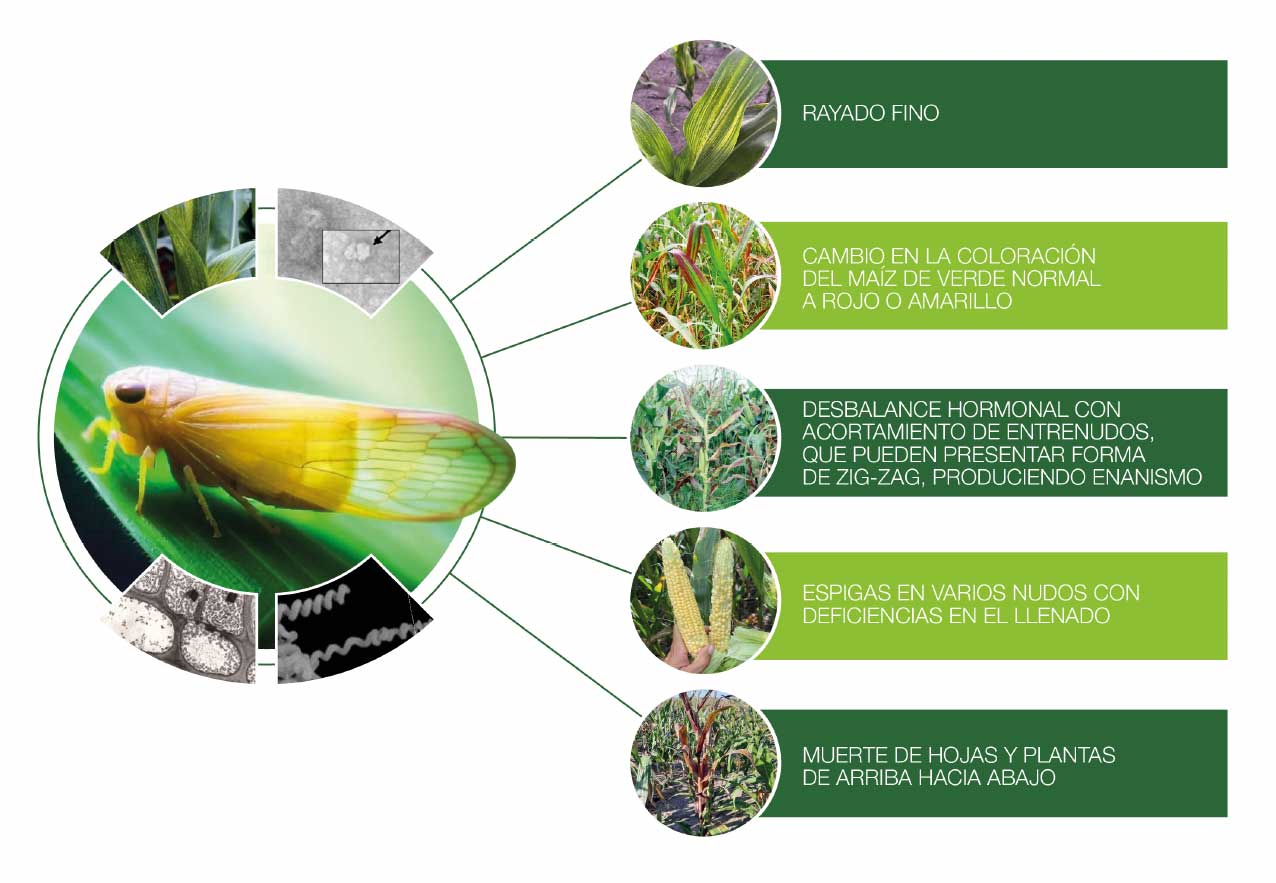 Es un complejo de enfermedades endémicas del cultivo de maíz que se manifiestan principalmente en la región subtropical de nuestro país (NEA-NOA) con incidencias y severidades interanuales importantes. Es causada por 3 diferentes patógenos (juntos o por separado), dos Mollicutes o bacterias sin pared celular y/o un virus. El predominante en el Norte Argentino es Spiroplasma kunkelii. Estos patógenos son transmitidos por un vector específico del maíz, la chicharrita Dalbulus maidis. Dependiendo del momento fenológico en que el vector infectivo transmita el o los patógenos, los daños económicos serán mayores o menores. El período de mayor susceptibilidad se encuentra entre V1 y V8.