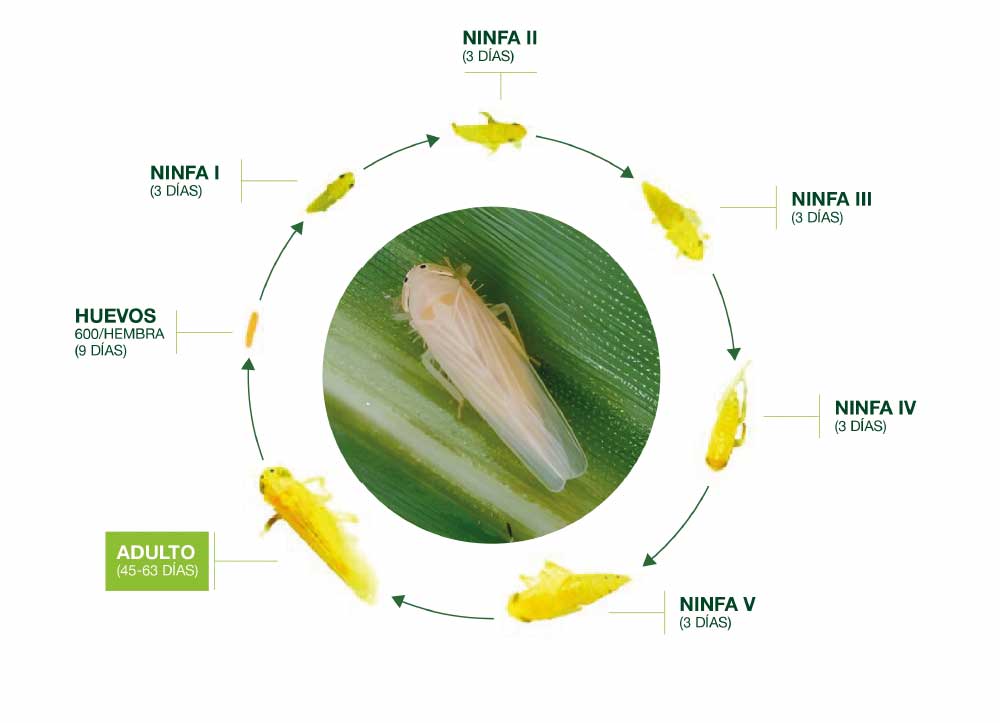 Dalbulus maidis Esta plaga pertenece al orden hemíptera. El adulto es color crema translúcido y mide entre 3-4 mm de largo. Presenta dos puntos más oscuros sobre la cabeza y las alas son más largas que el abdomen. Una hembra puede colocar de 200 a 400 huevos. Solo completa su ciclo de vida en maíz, aunque no se descarta que pueda alimentarse y sobrevivir en otras especies (hospederos secundarios). Dalbulus maidis transmite el Spiroplasma kunkelii en forma persistente propagativa; es decir que los individuos que adquieren el patógeno permanecen inoculativos el resto de su vida. En el norte argentino la plaga completa entre 7-9 Complejo de Achaparramiento del maíz.