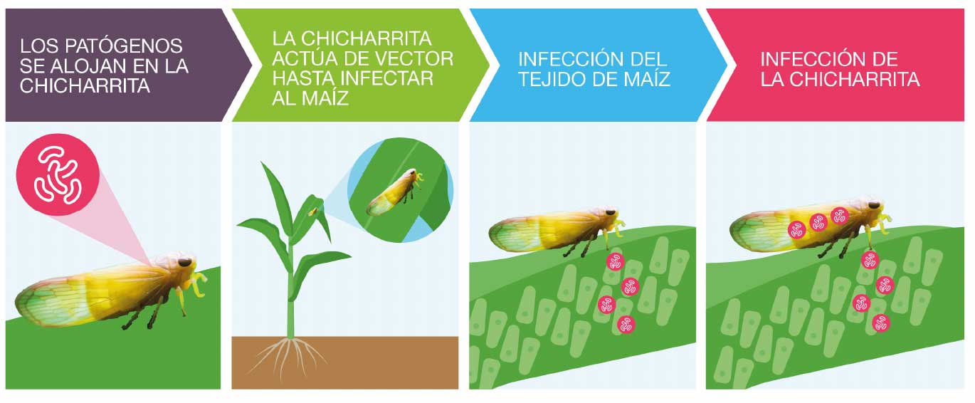 - Es fundamental que, tanto la chicharrita invernante (la que permanece en el lote) o la migrante (proveniente de otras regiones) NO encuentre maíz en el invierno y principio de la primavera (sembrado y voluntario) donde puedan alimentarse y reproducirse. Por eso es fundamental el control de plantas de maíz guacho, ya que son fuentes de inóculo de la enfermedad y hospederos de la chicharrita.